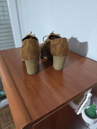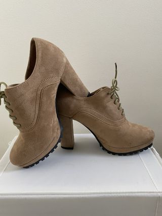 Botitas en color marrón claro, talla 36. Sin uso alguno. - Material tipo ante. - Cierre de cremallera lateral. - Cordones para ajustar. - Tacón bajo.