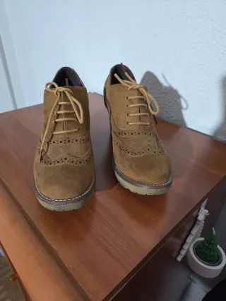 Preciosos botines de cuña en color marrón, son de piel tipo melocotón con cordones. Con uso, pero bien conservados. Talla 37. Medida aproximada de la plantilla interior 23cm cuña 8,5cm