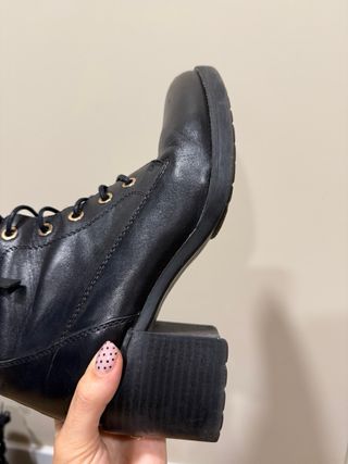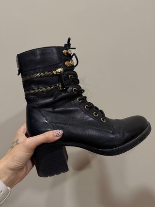 Botines de piel súper suave y flexible, son comodísimos. - Cierre de cordones y cremalleras doradas. - Tacón grueso. - Caña media. - Tacón de 6 cm.