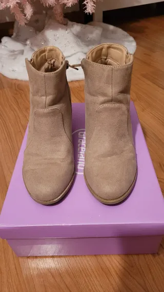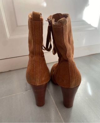 Botas de tacón de ante sintético. - Diseño de botín. - Cierre de cremallera lateral. - Detalle de cordón en la parte trasera. - Las vendo porque no puedo usar tacones.