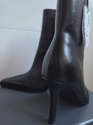Botines de charol con tacón de aguja y punta fina. - Cierre de cremallera lateral. - Diseño elegante y moderno. Actualmente en zalando están en 160€ podéis mirar son originales.