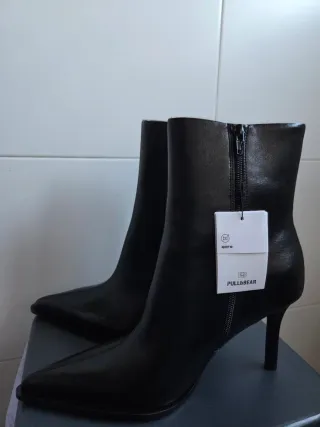 Botines negros de mujer, talla 38. Tacón fino, cómodos y elegantes. En buen estado general, con un pequeño detalle de uso que no afecta la apariencia ni la comodidad.