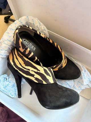 Elegantes botas de tacón Guess con diseño peep toe. - Material: Piel. - Color: Negro. - Cierre de cremallera en la parte trasera. - Tiras cruzadas decorativas. - Tacón alto y fino 10cm