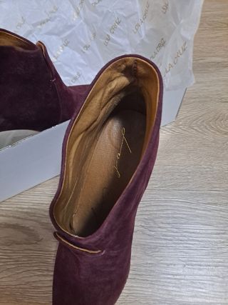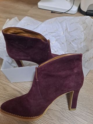 Botines piel granate para T37 y pie fino. Compradas el año pasado en Lola Cruz. Puestos en dos ocasiones porque tienen una altura de tacón a la que no estoy acostumbrada. Son cómodas por el tipo de suela de goma que se agarra bien al suelo y un tacón elegante sin llegar a ser de aguja. Costaban 149 en tienda.