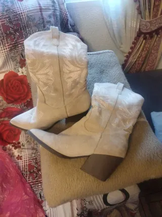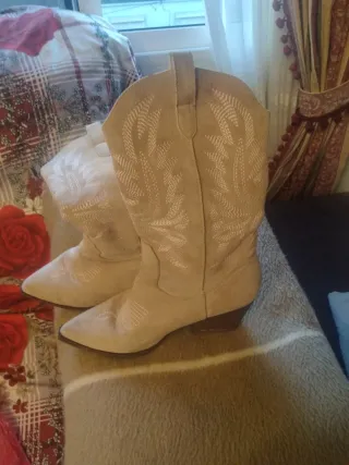 Botas de estilo cowboy con un diseño bordado. - Color beige claro. - Caña alta. - Punta fina. - Tacón bajo.