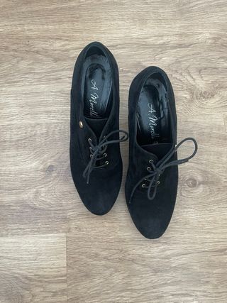 Botines de ante negros de la marca A. Morelli. Cierre de cordones. - Tacón de bloque. - Puntera fina. - Detalle de ojal metálico.
