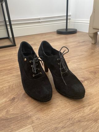 Botines negros de ante, con tacón fino y cordones en la parte delantera. Ideales para cualquier ocasión. - Material: Ante. - Tacón alto y fino. - Cierre con cordones.
