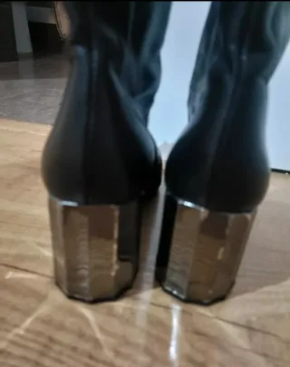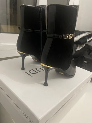 Botines de tacón alto con diseño moderno. - Cierre de cremallera en la parte trasera. - Tira en el tobillo. - Punta fina. Están en muy buen estado por guerra y por la zona suela aunque en la ultima foto se observa como la parte del cierre por dentro está un poco desgastada ( no se ve) y de ahí el precio ajustado. Se entregan en una dirección de Collblanc.