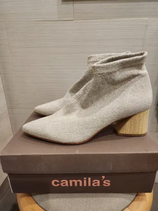 Botines de tejido tipo lino elástico en color beige. - Punta fina. - Tacón de bloque de madera - Precio original 95€
