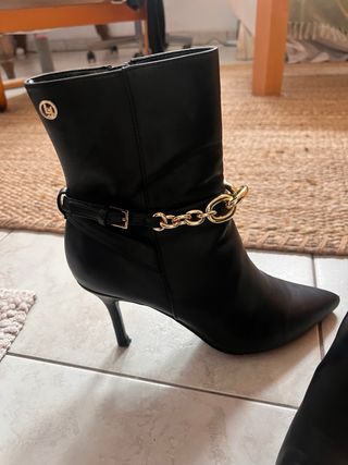 Preciosos botines negros de Liu Jo, muy elegantes y femeninos. Diseño con punta fina, tacón fino y detalle de cadena dorada con correa ajustable. Están en excelente estado, usados muy poco. • Marca: Liu Jo • Talla: 40 • Color: Negro con detalles dorados • Estado: Excelente, casi nuevos • Material: Polipiel • Estilo: Chic / Elegante / Noche / Otoño–Invierno
