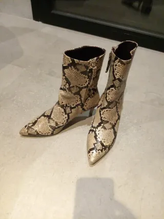 Botines de piel con un llamativo estampado de serpiente. - Diseño de punta afilada. - Cremallera lateral para facilitar su uso. - Tacón fino para un toque elegante. Usado solo en 3 eventos.