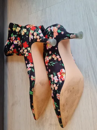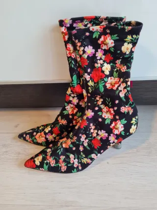 Botines de caña alta con un llamativo estampado floral sobre fondo negro. El diseño es elegante y moderno. La talla es la q pone en la foto 7 1/2M creo que equivale a 38'5 a 39 - Tacón fino y punta afilada. - Tejido elástico para un ajuste cómodo. - Detalle de flores rojas, rosas y amarillas.