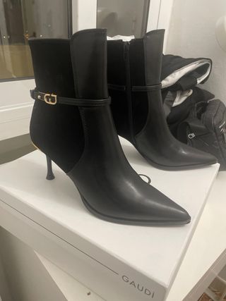 Elegantes botines de ante en color negro con detalle de hebilla dorada. - Diseño de punta fina. - Tacón alto y fino. - Tira decorativa en el tobillo con cierre de hebilla. - Paneles laterales elásticos para un ajuste cómodo.