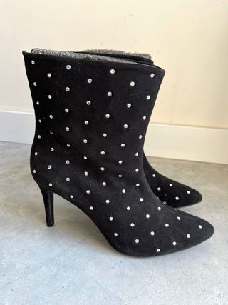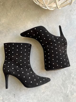 Botines de ante con tachuelas brillantes. - Diseño elegante y llamativo. - Tacón fino para estilizar la figura. - Perfectos para dar un toque especial a cualquier look.