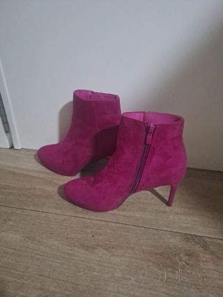 Botines de ante en un llamativo color rosa, perfectos para añadir un toque de estilo. - Diseño con plataforma. - Cierre de cremallera lateral. - Tacón fino. -Están perfectos, muy cómodos Un solo uso. Precio original 69€
