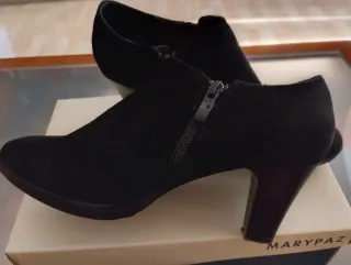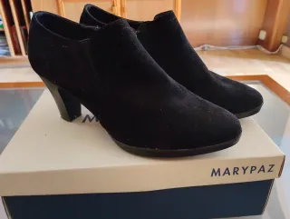 Botines de tacón de la marca Marypaz en color negro. - Material exterior de ante. - Diseño elegante y versátil. - Tacón grueso para mayor comodidad.
