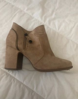 Botines de tacón en color beige, con detalle de cremallera lateral. - Material exterior tipo ante. - Tacón grueso. - Cierre de cremallera.