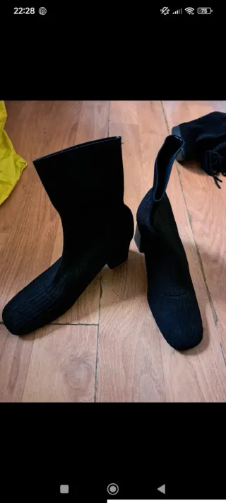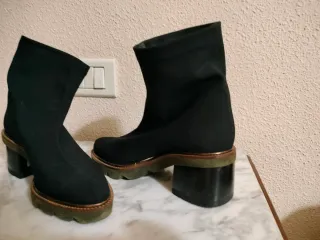 Botines de tela negros, con un diseño moderno y cómodo. Poco uso - Material elástico. - Tacón grueso.