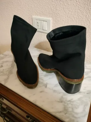 Botines negros con tacón grueso y diseño moderno. Usado muy pocas veces, esta como nuevo menos el botin derecho que tiene un ligero desperfecto que se puede apreciar en las imagenes - Material exterior sintético. - Tacón cuadrado de altura media. - Punta redonda