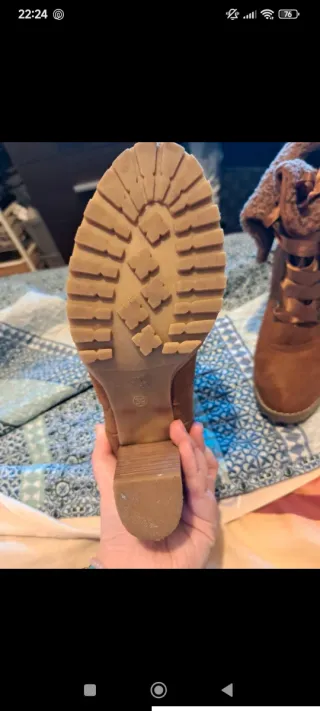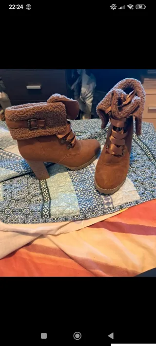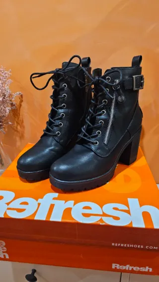 - Botines Refresh de tacón con plataforma, en perfecto estado, casi nuevos. - Usados media hora. - Cierre con cordones y cremallera lateral. - Detalle de hebilla. - Suela gruesa. - Los vendo porque no puedo llevar tacones ☹️