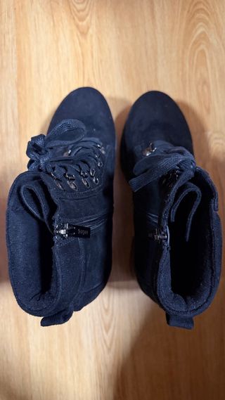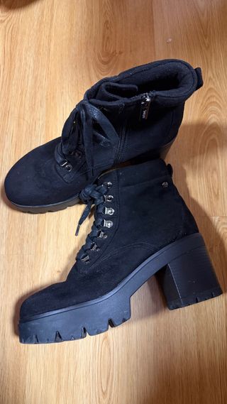 Botines con plataforma y tacón grueso. - Cierre de cordones y cremallera lateral. - Detalle de ojales metálicos. - Material exterior tipo ante. - Suela de goma con buen agarre.