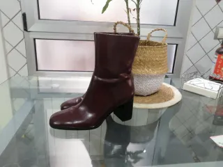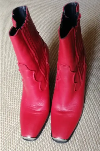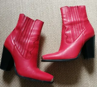Botines de piel auténtica, de estilo campero de la marca Mango. Muy cuidados, salvo alguna pequeña mancha típica del uso, puestos ni se aprecian (adjunto fotos detalladas) Tienen media plantilla de Memory Foam que los hace más confortables. -Número 39 - Color rojo (no tan vivo como en la foto) - Tacón grueso negro de 9,5 cm - Punta cuadrada con detalle metálico. - Diseño con elástico lateral.