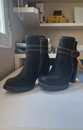 Botines de mujer con un diseño moderno y elegante. - Material exterior de ante. - Cierre de cremallera lateral. - Detalle de hebilla decorativa. - Tacón grueso para mayor comodidad.