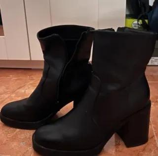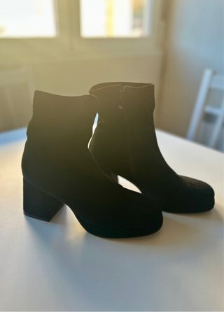 Botines de tacón con plataforma. - Material exterior de ante - Cierre de cremallera lateral - Tacón grueso y cuadrado - Punta redonda Perfectos para combinar con vaqueros, vestidos o faldas. En muy buen estado, apenas usados, sin desperfectos visibles. Si tienes cualquier duda, pregúntame sin problema 😊💖