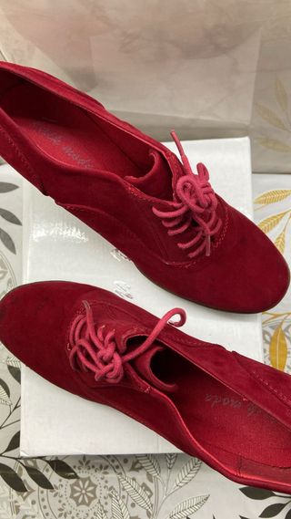 Botines de tacón con un diseño elegante y moderno. - Material: Antelina - Color: Rojo - Cierre: Cordones - Tacón grueso y alto Solo se han usado para salir un día, tienen unas pequeñas salpicaduras. Se enseñan sin compromiso