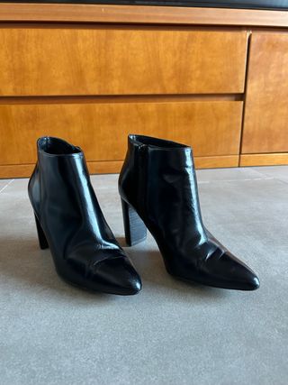 Botines de tacón con un acabado brillante y detalles elegantes. Nunca usados. - Cierre de cremallera lateral. - Detalle de pedrería en el elástico. - Tacón grueso para mayor comodidad.