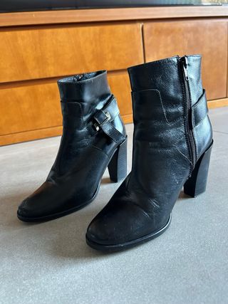 Botines de tacón de piel. - Diseño elegante con hebilla. - Cierre de cremallera lateral. - Tacón grueso y cuadrado.