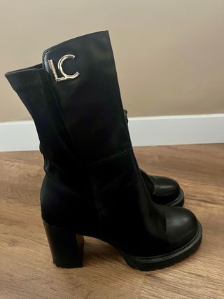 Botines de tacón con detalle de logo LC. - Tacón grueso. - Plataforma. - Diseño moderno.