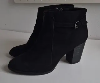 Elegantes botines de tacón con un diseño calado negro. • Tacón grueso y cómodo (8cm) • Material: ante o serraje. 🚚 Envío o trato en persona.
