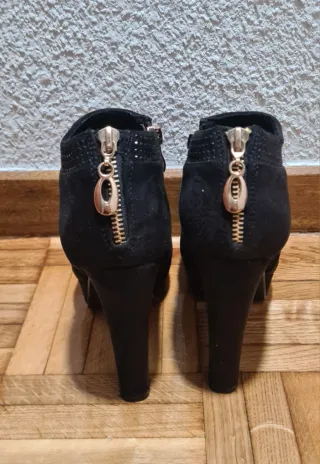 Botines de tacón alto con un diseño elegante en talla 37 - Material exterior de ante. - Detalle de pedrería en la parte superior. - Cremallera lateral para facilitar el calce. - Tacón grueso de 11 cm y plataforma delantera de 3 cm. Están prácticamente nuevos, solo se han usado 1 día. **SOLO RECOGIDA EN ALCORCÓN **