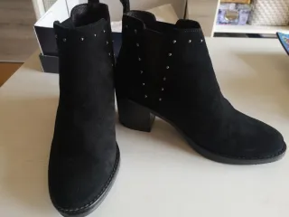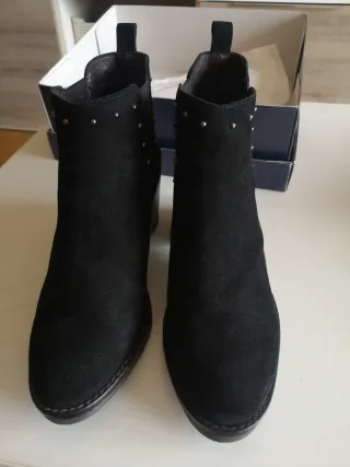 Botines de ante con tacón. Un básico para tu armario. - Tacón grueso y cuadrado. - Punta fina. - Cierre de cremallera lateral. Piel Algun roce en tacon pero puestos dos dias