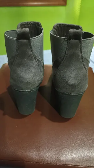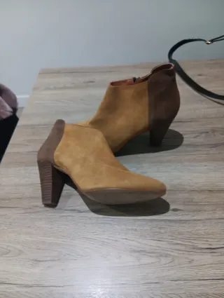 Botines con tacón de estilo moderno. - Combinación de materiales en cuero y ante. - Tacón grueso para mayor comodidad. - Diseño de caña baja. - Desgaste por el uso (ver fotos)