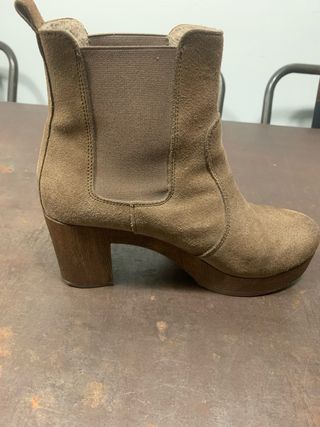 Botines de estilo Chelsea con tacón de madera. (le falta poner suelas) - Material exterior de ante. - Detalle de elástico lateral. - Tacón grueso de madera. - Plataforma delantera.
