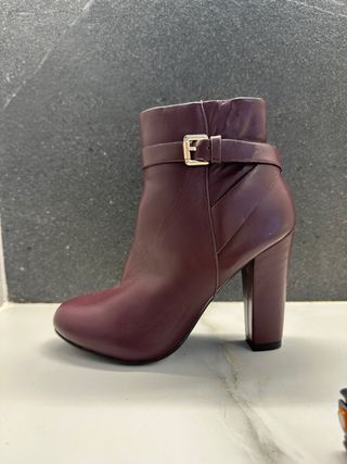 Elegantes botines de tacón con un diseño moderno. - Material: Piel. - Color: Morado. - Detalle de hebilla dorada. - Tacón grueso.