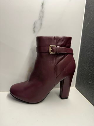Botines de tacón con detalle de cremallera y hebilla. - Material exterior de piel original. - Hebilla decorativa en el lateral. - Tacón grueso y alto. - Muy cómodos, poco uso. - Son muy ligeros. - Todas las medidas en las fotos.