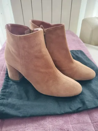 Botines de ante en color camel, talla 38. - Diseño elegante y versátil. - Tacón grueso para mayor comodidad. - Cierre de cremallera lateral.