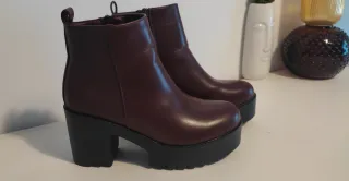 PRECIO NO NEGOCIABLE!! Botines de plataforma en polipiel color burdeos / granate. - Tacón grueso y plataforma. - Cierre de cremallera lateral.