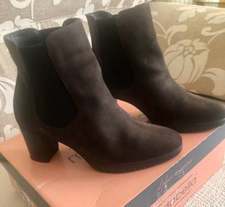 Prácticamente nuevos. Usados 3 veces. Botines de tacón con acabado en serraje. - Tacón grueso de madera. - Diseño elástico. - Punta cuadrada.