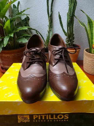 Botines de estilo Oxford con cordones, combinando tonos marrones y beige. Un diseño clásico con un toque moderno. - Detalle de picado decorativo en los bordes. - Tacón grueso.