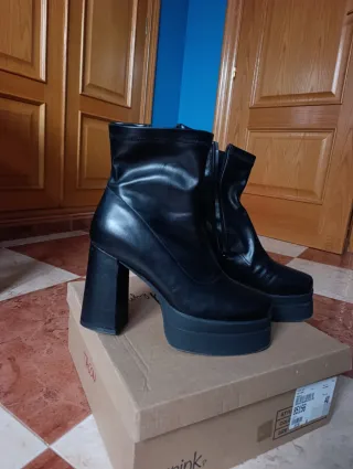 Botines de tacón alto con plataforma. - Diseño moderno y atrevido. - Tacón grueso y cuadrado. - Plataforma delantera. Talla 39 Altura casi 12 cm Plataforma 4 cm