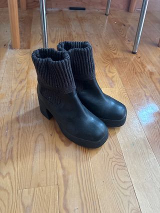 Botines negros con detalle de tejido en la parte superior. - Tacón grueso. - Suela de plataforma. - Diseño moderno y cómodo.