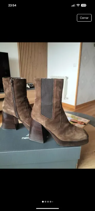 Botines de tacón con un diseño moderno y cómodo. - Material exterior de ante. - Cierre de cremallera lateral. - Tacón grueso y plataforma. - Detalle de tirador en la cremallera.