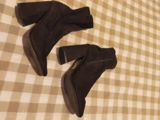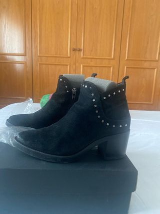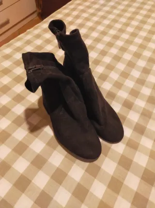 Botines de tacón con un diseño moderno y elegante. - Material de ante. - Tacón grueso y cuadrado. - Cremallera trasera para facilitar el calce. - utilizados 1 vez. Los vendo porque me quedan grandes.