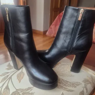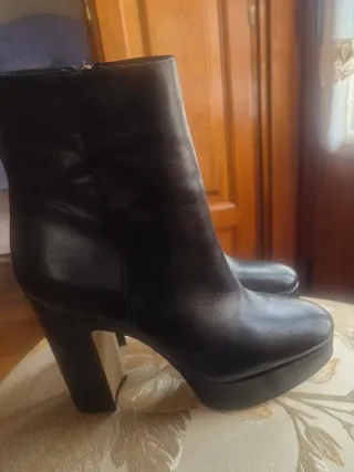 Botines de tacón con plataforma. - Material exterior de piel. - Cierre de cremallera lateral. - Tacón grueso y cuadrado. - Punta redonda.