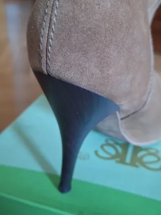 Zapatos abotinados de tacón de unos 10cm. Con cremallera en interior para abrochar. Piel por la puntera y ante por el talón. Muy pocos usos.