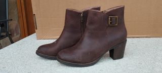 Botines marrones con tachuelas doradas. Altura de tacón 6cm. Son muy cómodos. Están usados en pocas ocasiones, pero se ha desgastado el tacón. Adjunto fotos. Por lo demás están perfectos.
